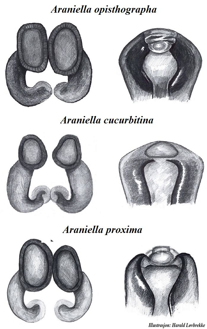 Araniella cucurbitina, A. opisthographa und A. proxima. Vergleich der Vulven/Epigynen. Links Vulva ventral und rechts die Epigynenansicht von den Spinnwarzen her gesehen.