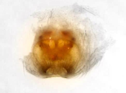 Clubiona lutescens, Epigyne präpariert (Vulva ventral) 20.08.12, feuchter Waldrand Stgt-Zuffenhausen MTB 7120-4. Foto urheberrechtlich geschützt, Copyright Tobias Bauer. Vor Fremdverwendung bitte nachfragen.