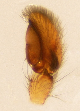 Clubiona vegeta, Pedipalpus. Tier 3,5 mm, aus niedriger Vegetation einer Küstendüne bei Longeville, Frankreich (13.11.2012).