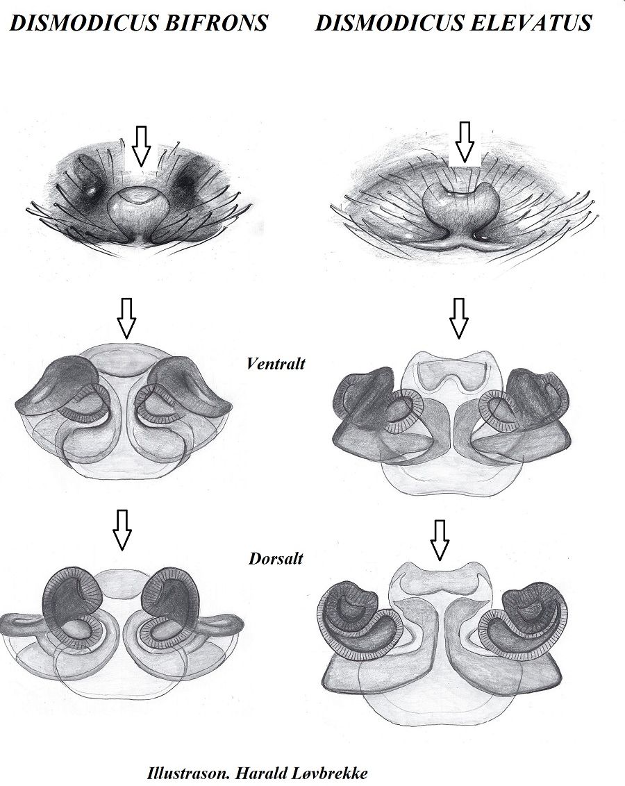 Dismodicus bifrons vs. Dismodicus elevatus, Vergleich Epigyne und Vulvenstruktur. Zur Unterscheidung betrachtet man die "Weinglas"-ähnliche Struktur, welches bei D. bifrons oben gerundet-geschlossen und bei D. elevatus oben offen ist (siehe Pfeil). Die Vulven zeigen in diesem Bereich konkave (D. bifrons) bzw. konvexe, bzw. gewellte (D. elevatus) Strukturen.