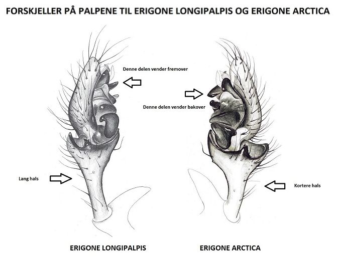 Erigone longipalpis vs. Erigone arctica, Vergleich der Pedipalpen. E. longipalpis hat den längeren Hals und einen Fortsatz, der nach vorne gerichtet ist, während er bei E. arctica nach hinten gerichtet ist.