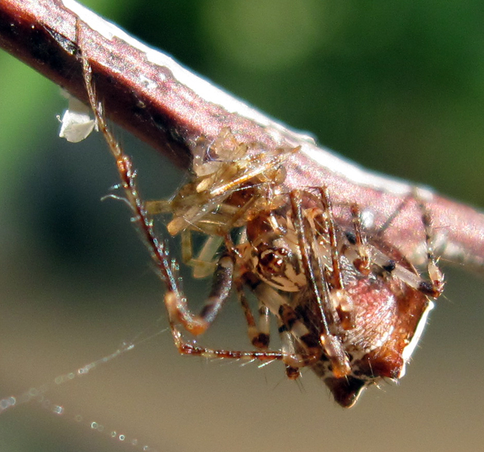 Ein Weibchen von Ero tuberculata mit Beute (Parasteatoda tepidariorum) im Portrait