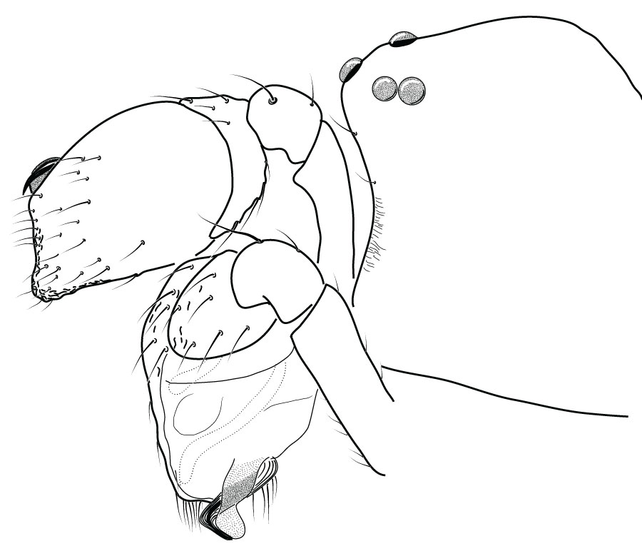 Euryopis margaritata Männchen, Prosoma und Pedipalpen, Lateralansicht. Zeichnung.
