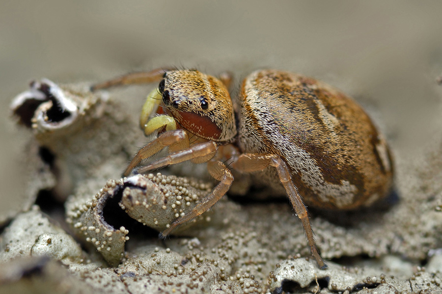 Heliophanus tribulosus,Weibchen, Foto urheberrechtlich geschützt. Vor Verwendung außerhalb dieses Wikis bitte nachfragen. Autor: Horst Hellwig