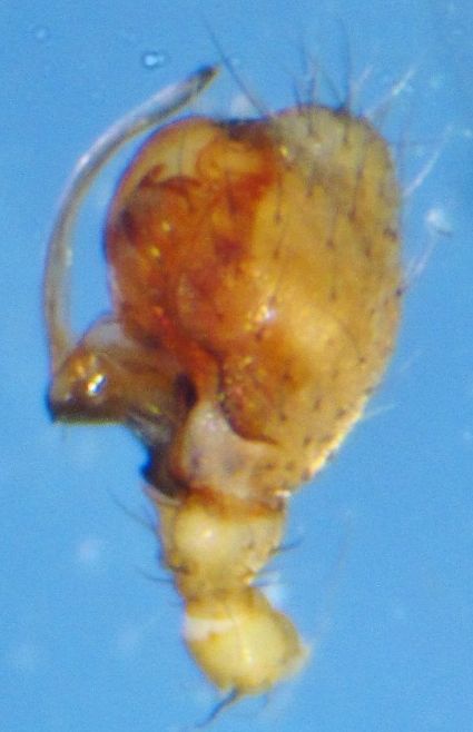 Improphantes complicatus, Pedipalpus. Tier 1,8 mm, vom Berg Skåbufjellet (1510 m ü.NN), Norwegen, Juli 2015.