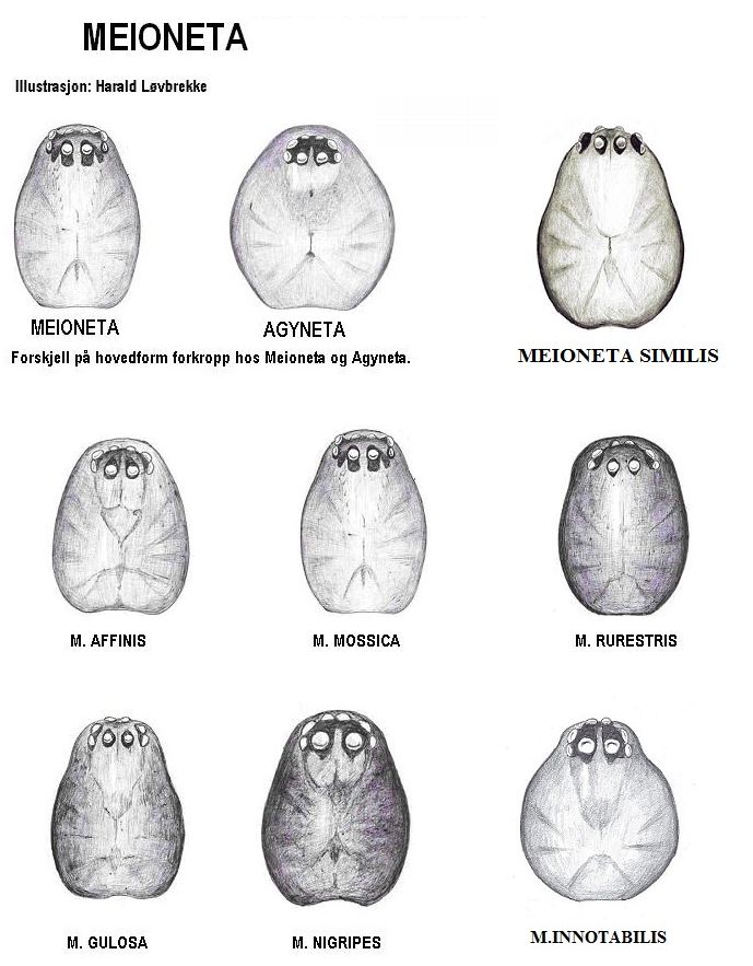 Meioneta, Prosoma-Übersicht der Männchen von 7 Arten der Gattung, sowie Vergleich Meioneta vs. Agyneta. Tiere aus Norwegen.