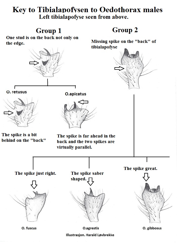 Oedothorax, Schlüssel zur Identifizierung der Männchen von 5 Arten, die in Norwegen vorkommen, anhand der Tibialapophyse.