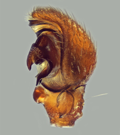 Ozyptila scabricula, Pedipalpus. Tier, 3,58 mm, aus Bodenfalle bei Nismes, Tienne aux Boulis, Belgien, 15.08.2008.
