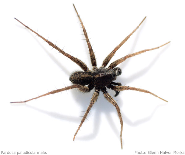 Pardosa paludicola, Männchen. Foto urheberrechtlich geschützt. Vor Verwendung außerhalb dieses Wikis bitte nachfragen. Autor: Glenn Halvor Morka.