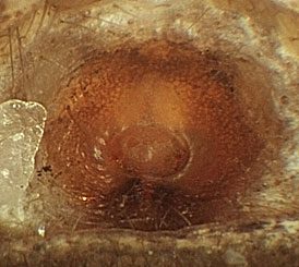 Xysticus sabulosus, Epigyne, Foto urheberrechtlich geschützt. Foto urheberrechtlich geschützt. © Jürgen Fischer J.fischer@rswun.de. Vor Fremdverwendung bitte nachfragen.