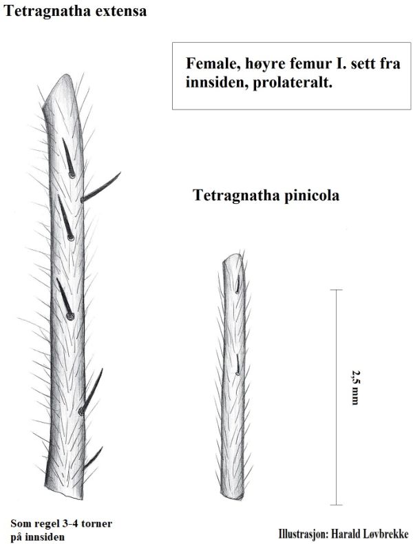Tetragnatha extensa (links) und Tetragnatha pinicola, Gegenüberstellung der Bestachelung an Femur I beim Weibchen.