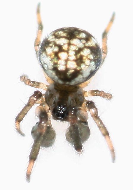 Theridiosoma gemmosum, Männchen (1-2 mm) von Feuchtwiese. Foto urheberrechtlich geschützt. Vor Verwendung außerhalb dieses Wikis bitte nachfragen. Autor: Tobias Töpfer