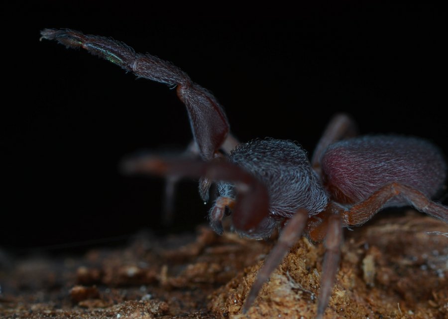 Palpimanus gibbulus, Weibchen benutzt die Vorderbeine wie Antennen. Tier 7mm, unter Stein gefunden, aus Uri in Sardinien.