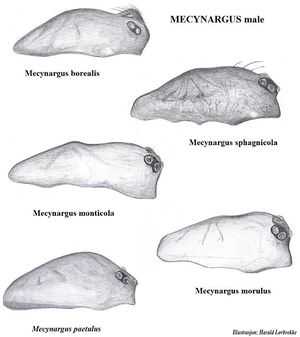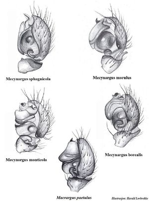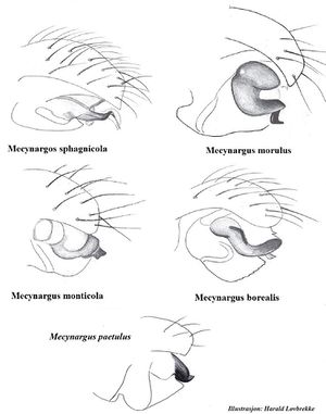Zeichnungen von Harald Løvbrekke zu 4 Arten der Gattung, die in Norwegen gefunden wurden. Dargestellt werden Mecynargus sphagnicola, Mecynargus morulus, Mecynargus monticola und Mecynargus borealis.