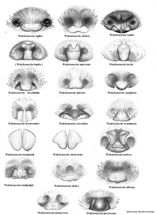 Die Männchen der meisten Arten besitzen Kopfauswüchse in verschiedenen Formen. Ohne Kopfauswüchse sind: W. nudipalpis, W. obtusa und W. vigilax. Auch die Kopfregionen der Weibchen sind oft erhöht (siehe Prosoma-Übersicht nach Løvbrekke weiter unten).