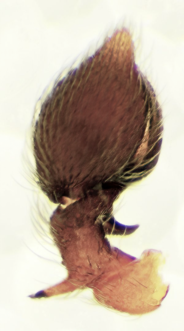 Dictyna uncinata, linker Pedipalpus dorsal. (Tier 3 mm, aus Feuchtbiotop Kager-Oberbayern, Kescherfang (Jan13)).